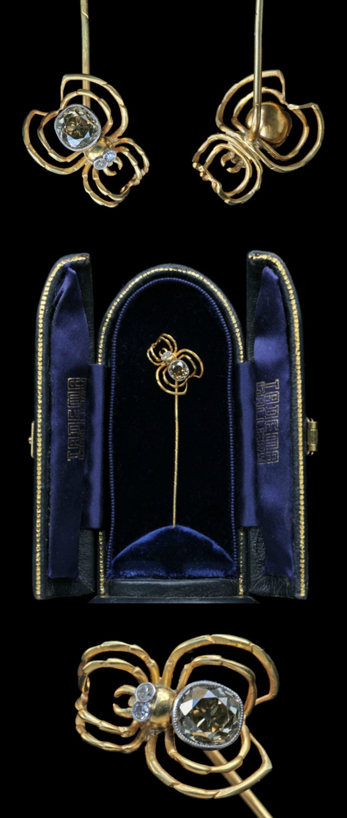 This beauty is similar in era to the previous piece of spider jewelry, but very different in execution. This Art Nouveau stickpin is streamlined compared to its predecessor, but its bold diamond-set body and curved extremities make a statement all the same.