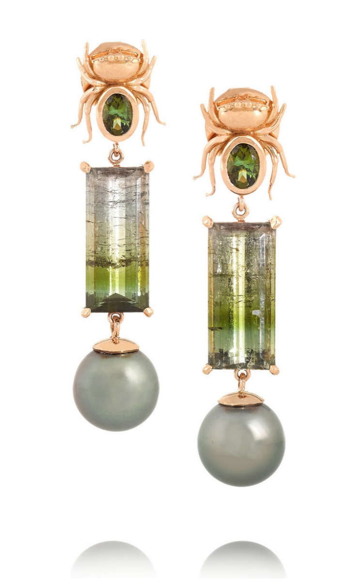 First up: they’re rose gold. How often do you see a pretty-in-pink spider? Then: those tourmalines! Yeah. Hard to resist. And finally the subtle spider surmounts, tourmaline-bodied, which cling to the earlobe. Badass.