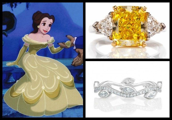 I think the connection here is pretty obvious: the yellow diamond with blue sapphires is a perfect match for Snow White’s favorite (or only) outfit. A Disney Princess engagement ring must be an appropriate color!