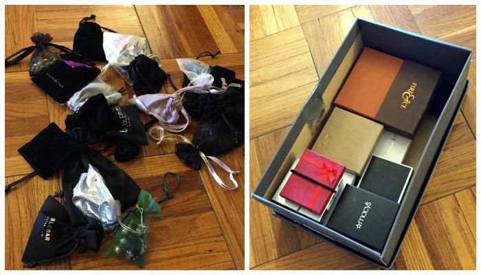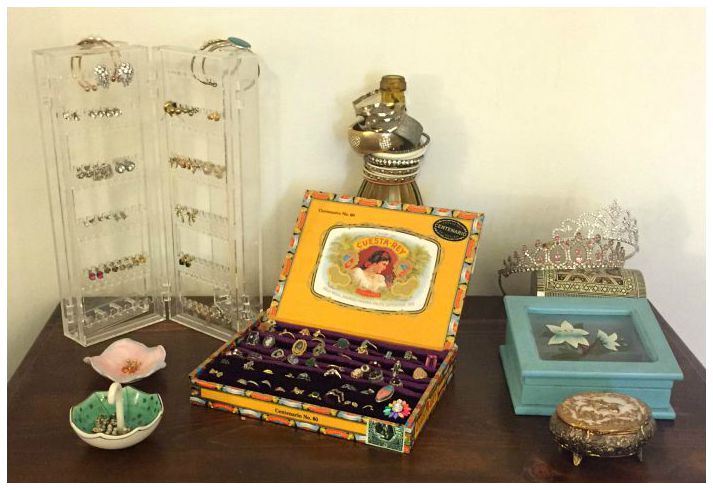 - Jewelry boxes and pouches saved from years of collecting.