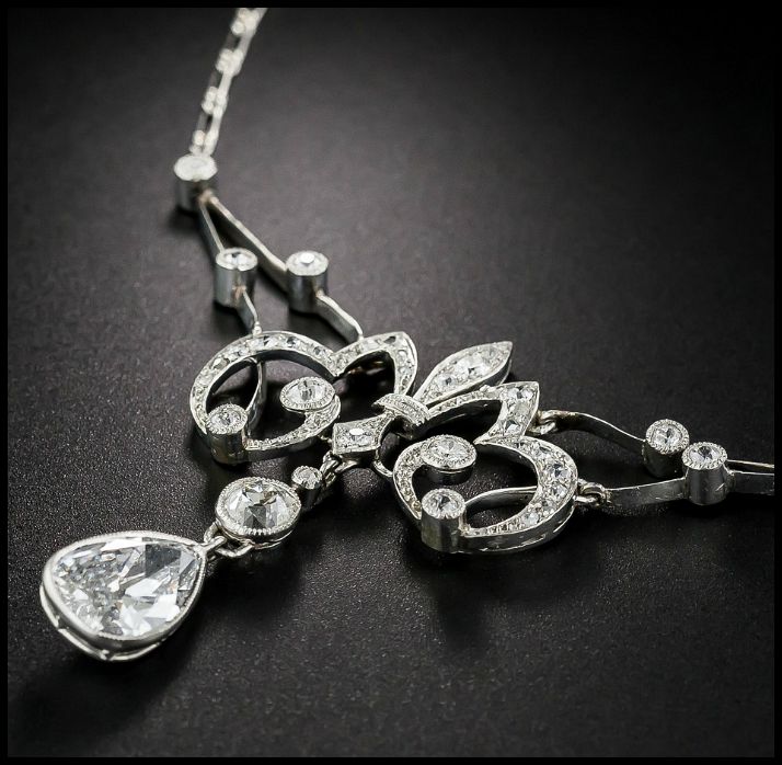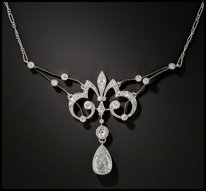 This beautiful piece is French Belle Epoque, and circa 1900, which makes it a little older than the earrings. It is also platinum, and suspends a brightly white pear-shaped diamond. The settings are all delicately millegrained, and the central element forms a bewitching, vaguely fleur-de-lys style pattern.