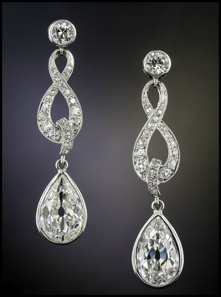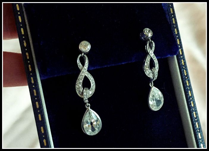 These babies are Edwardian, dating to around 1915. 3.35 carat total diamond weight in gleaming platinum. The infinity motif of the design appealed to me for a wedding and the big, juicy old mine-cut pear-shape diamonds appealed to me in every possible way. With thick, dark, curly hair like mine, you can’t wear just any earrings.