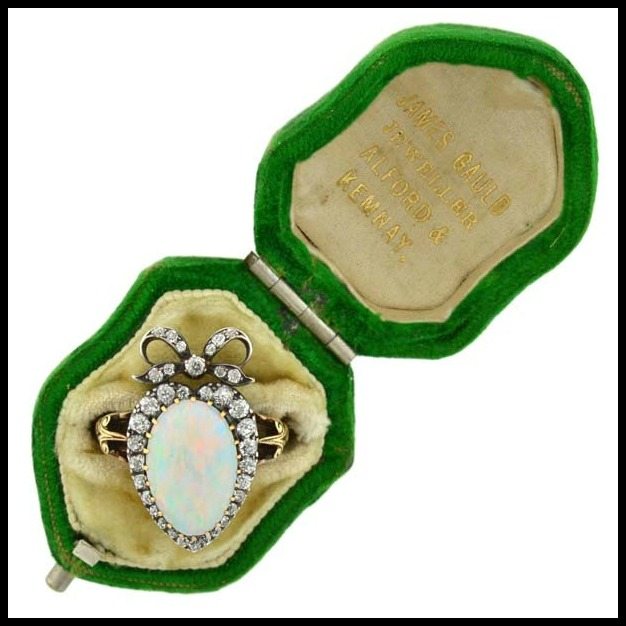 If you hadn’t guessed by the perfect color contrast and custom fit, the antique ring box in the photo above is this antique opal ring’s original box from 1870. I know – just when you thought it couldn’t get any better, right? The inside top of the box is stamped “JAMES GAULD JEWELLER ALFORD & KEMNAY.”