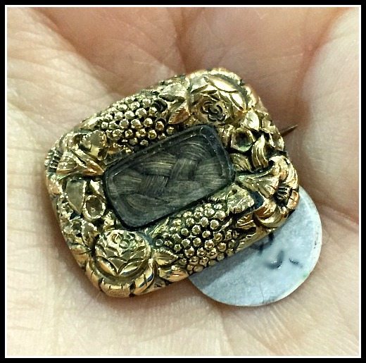 Here’s a pretty little mourning brooch in gold with braided hair. I’m not sure exactly what it was that appealed to me about this piece, but it just felt like something special. A tiny, lovely testament to someone who was loved and lost long ago. I saw it at Trinkets and Treasures.