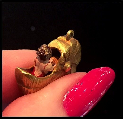 This vendor – Maxine Wolf Shapiro Antiques – also had a fabulous collection of antique and vintage gold charms. Charms are something I’ve only recently discovered as a source of endless delight, and oh my, how delightful they are. The bathing beauty above is apparently modeled after a ride that used to run at Coney Island.