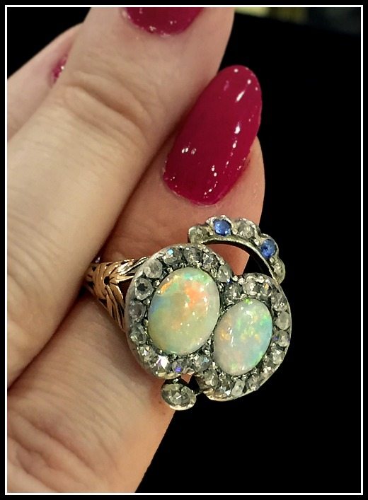 This double opal heart ring stopped me in my tracks as I was on my way to somewhere else. It’s antique, although I don’t remember what I was told about the era (I’d guess Georgian or early Victorian, based on style). I just love the gold shank and the crowning detail of sapphire and diamonds.