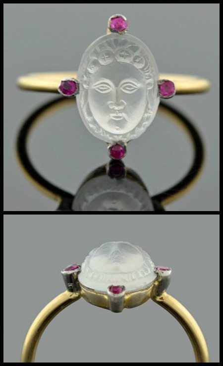 This charismatic little ring is an Art Nouveau cameo ring formed from a carved moonstone face surrounded with rubies. Isn’t it interesting? It reminds me of ghosts or the moon, but I mean both of those in a very positive way.