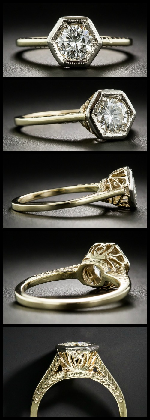 Here’s a classic Art Deco beauty to kick things off! A low and lovely die-struck setting from the 1930’s, this beauty centers an old European cut diamond in a platinum bezel. This is a perfect example of the kind of filigree that is much more common in white metals; to find it in yellow gold makes this piece more remarkable.