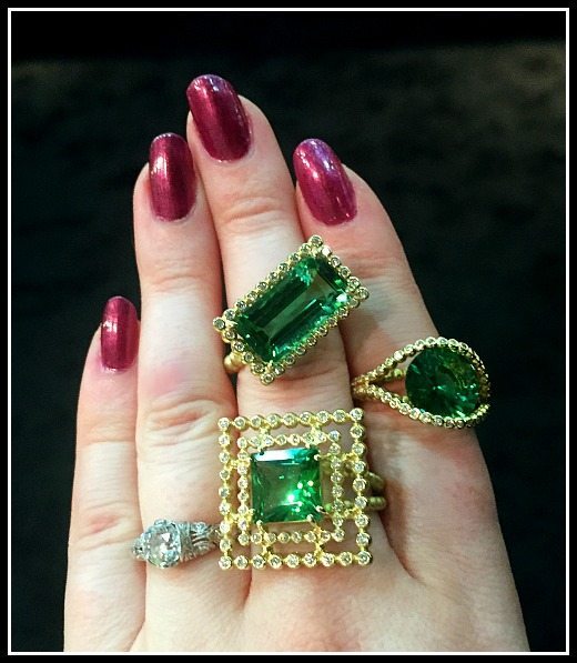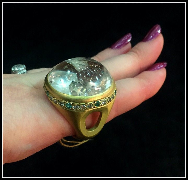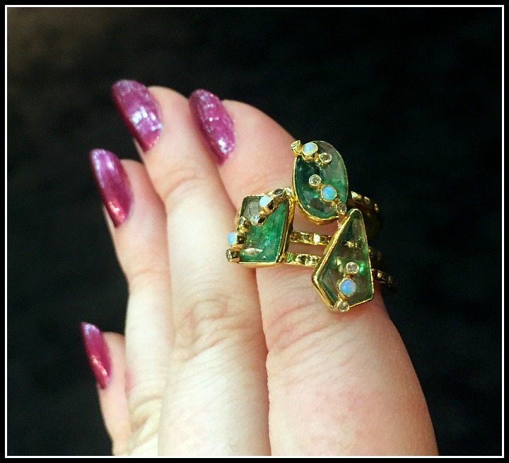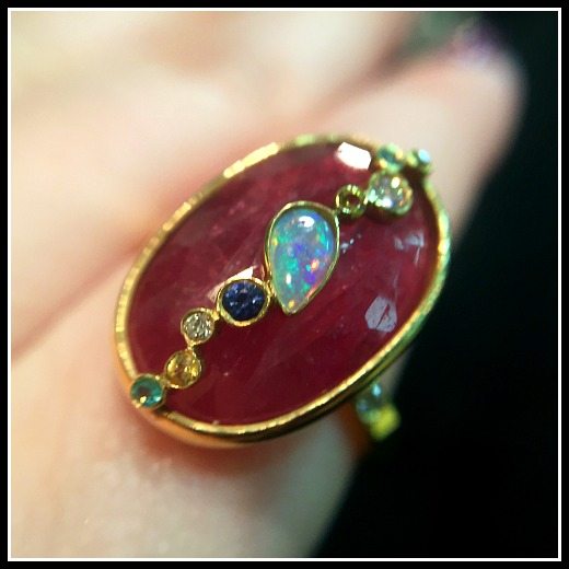 If you want your jaw to drop even further, think about this: Sarah of Amali Jewelry told me that when she works with a stone like this, she has to polish down their plain outside one tiny layer at a time to try to figure out what will reveal the most of the iridescent spectacle within. Such an incredible collaboration of geology and art!