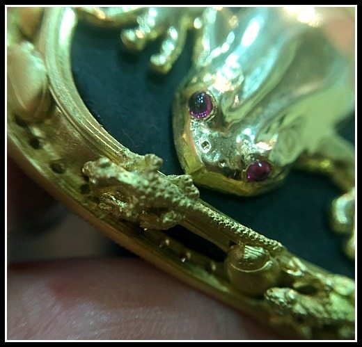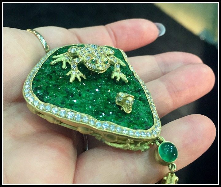 And speaking of frogs…how great is this little golden guy, just chillin’ on his Uvaravite drusy lily pad with his snail friend? My favorite part of this piece (besides the richness of the colors and precision of the frog and snail) were the nearly-hidden embellishments on the side and back: