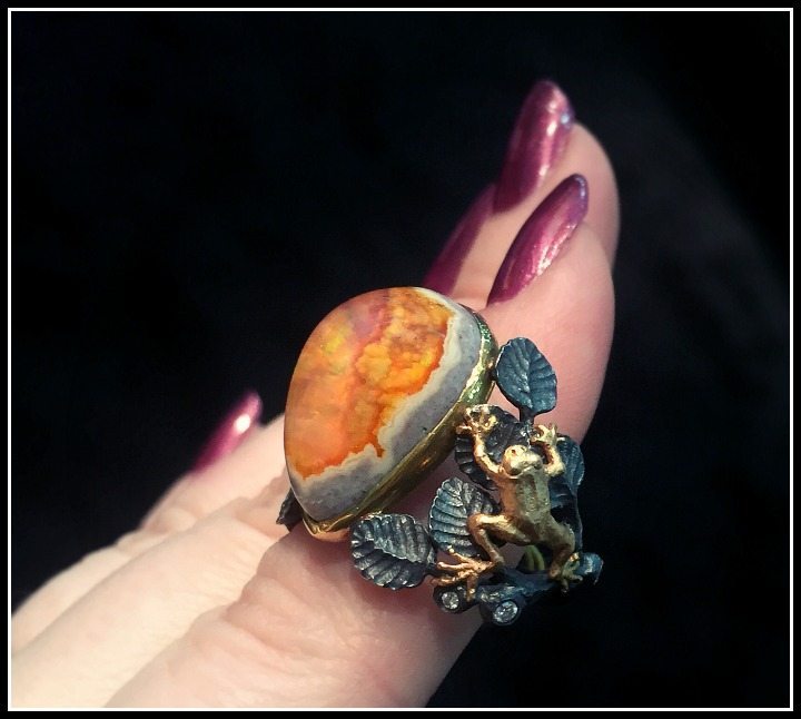 This tree frog ring was another that caught my eye. I’ve seen Anthony Lent’s tree frog ring before, with a different stone (a chrysoprase?) but this fire opal blew me away. The stone looks like it’s literally filled with fire – can’t you see the roiling smoke?
