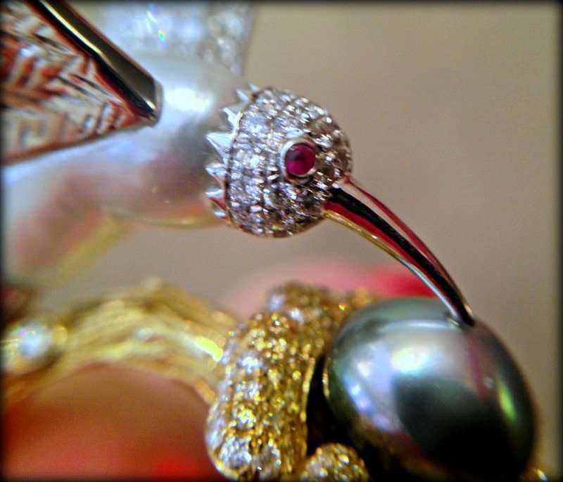 The details were breathtaking. Be sure to notice the texture on the inside of the wings, the carefully worked stem and petals of the flower, and the fact that the bird’s body is a perfectly contoured pearl.