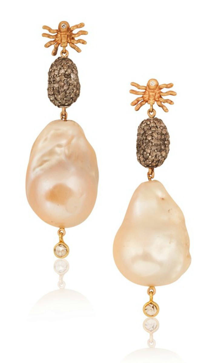 First up: they’re rose gold. How often do you see a pretty-in-pink spider? Then: those tourmalines! Yeah. Hard to resist. And finally the subtle spider surmounts, tourmaline-bodied, which cling to the earlobe. Badass.