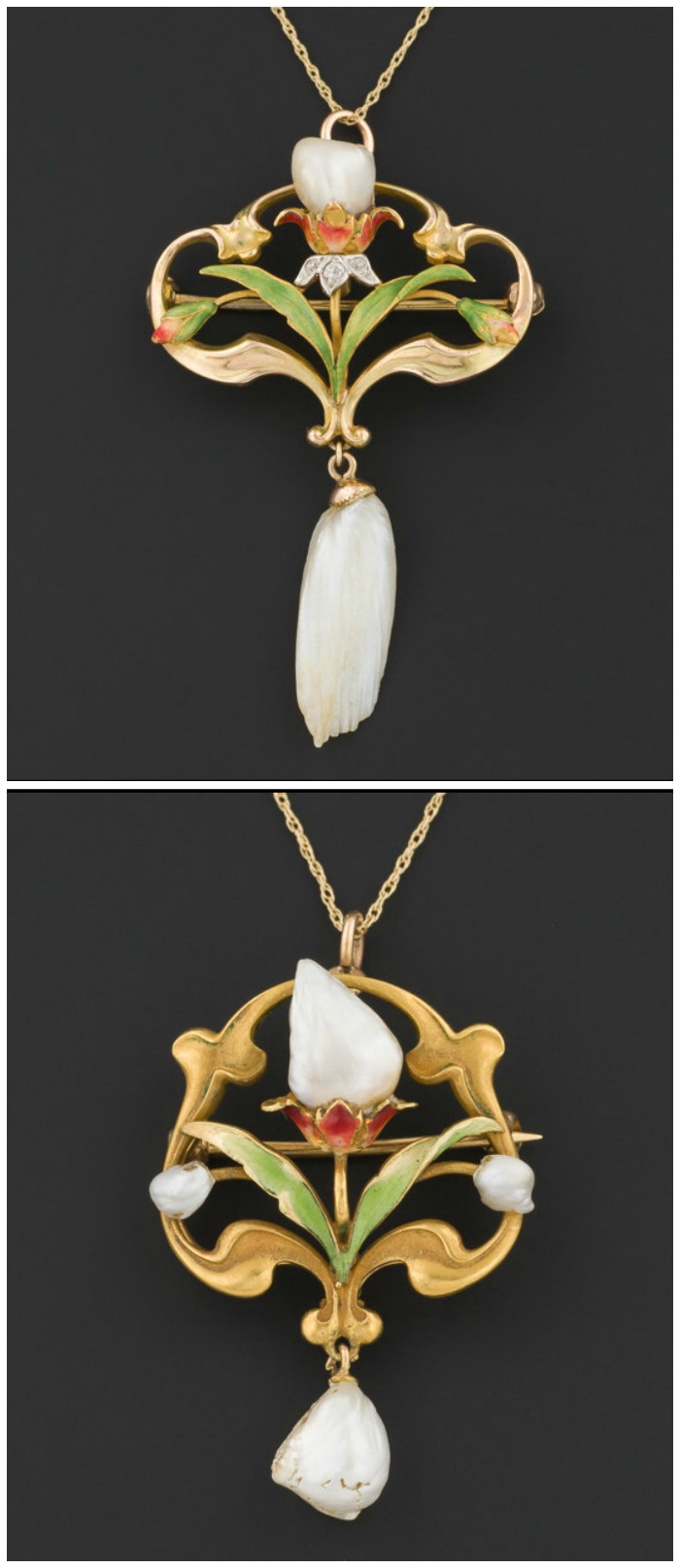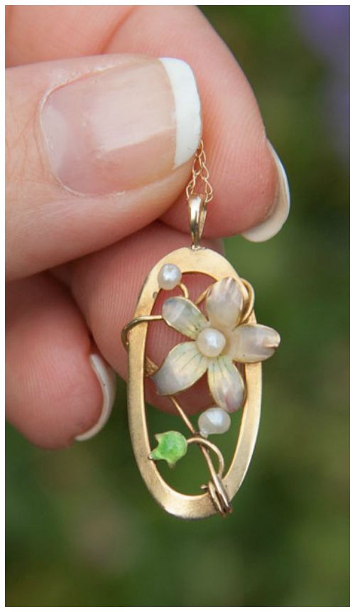 This Art Nouveau pendant is antique, probably dating to the early 1900’s, and features a beautiful floral design in enamel over 14k gold. The prize includes the lovely 14k gold chain shown in the photos, so the lucky winner will receive this piece in ready-for-action condition.