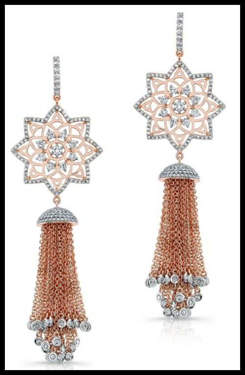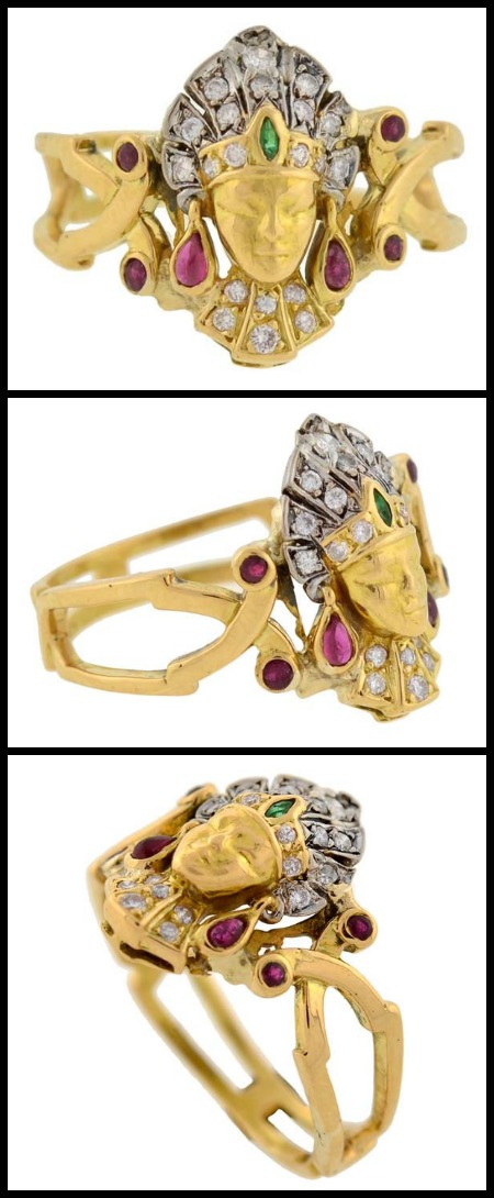 I’ve never seen anything quite like this Art Deco ring before. It reflects the Egyptian Revival style, the result of the 1920’s obsession with ancient Egypt. This ring has a glorious split shank design in 18k gold which supports the most magnificent headdress-wearing figure rendered in gold gemstones. My favorite part is those luscious ruby drop earrings that the figure in the ring is wearing.