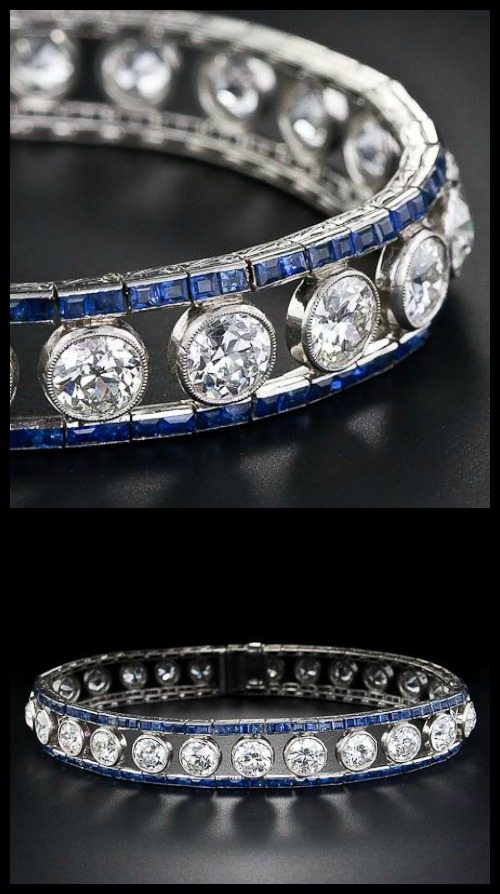 French Art Deco diamond and sapphire bracelet, circa 1925. 10 carats of diamonds bordered by calibre-cut sapphires ($60,000).