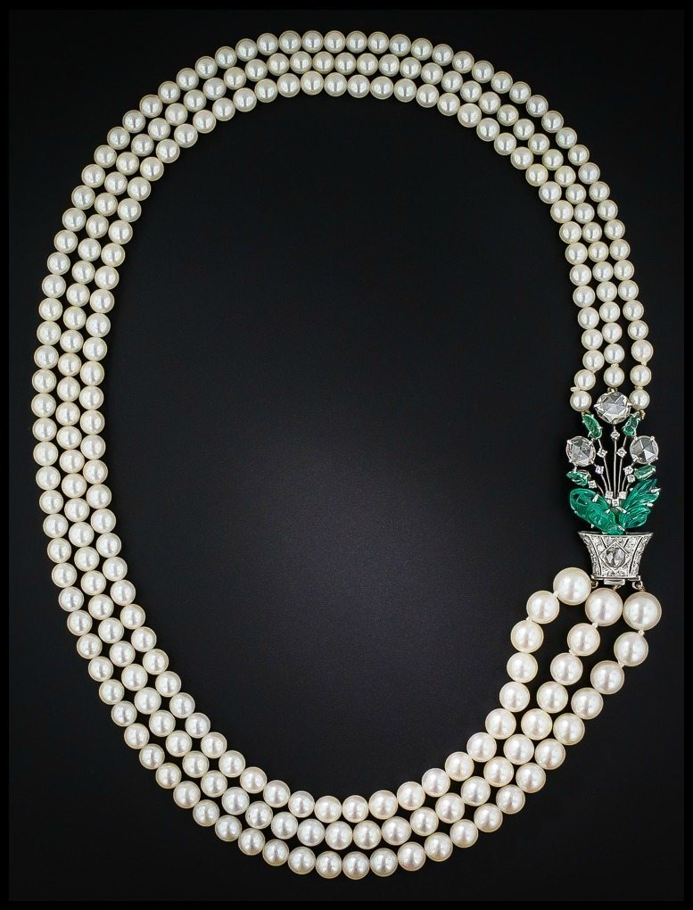 This pearl necklace was made in 1890 and features natural pearls and diamonds set in gold and silver.