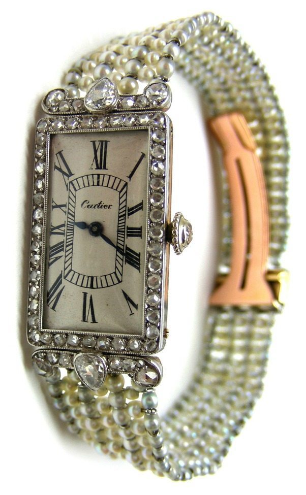 It’s breathtaking, isn’t it? Obviously Cartier, it was made in Paris in 1905. The dial is white enamel with black painted Roman numerals. Surrounding the face is a pave-set rose-cut diamond bezel with scrolling pear-cut diamond-set shoulders and a diamond-set winder. The watch strap is a seven row white and grey pearl bracelet concealing a rose gold and platinum deployant clasp. The watch is signed Cartier on the dial with serial numbers 20103 and 11397 to the reverse of the platinum case.