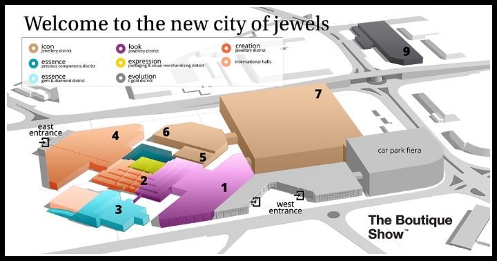 The six pillars above represent the six communities that made up the “jewelry city” that was the VicenzaOro Boutique Show’s layout.
