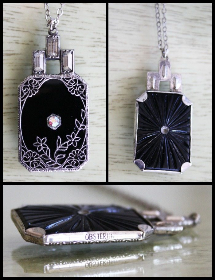 This unusual beauty is by the notable Ostby Barton. I didn’t realize camphor glass could be black, but that’s what the listing says this is and from the detail photos, I’m inclined to believe it. It’s such a striking juxtaposition of colors, with the light tendrils of filigree snaking across the glossy dark surface. I also adore the baguette shaped rhinestone detail above the pendant bail – deliciously geometric is that Art Deco way I love so much.