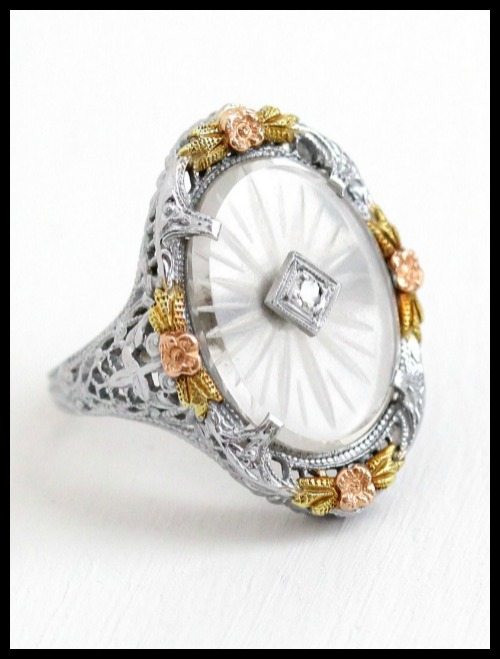 A pretty camphor glass ring, or THE PRETTIEST camphor glass ring? With that lovely filigree and tri-color yellow/rose gold floral details, I think it’s making a strong case for the latter.