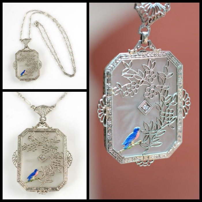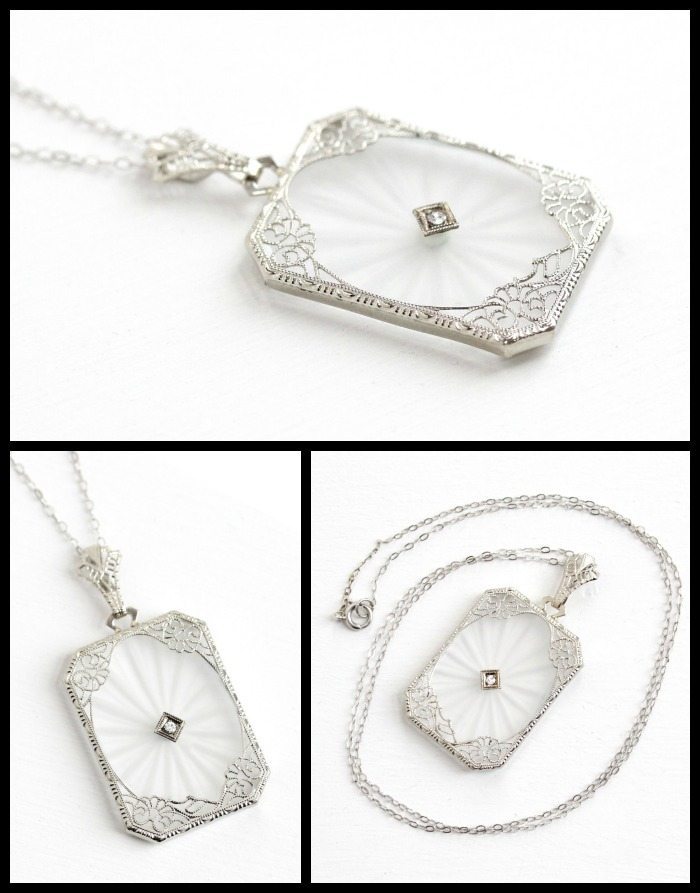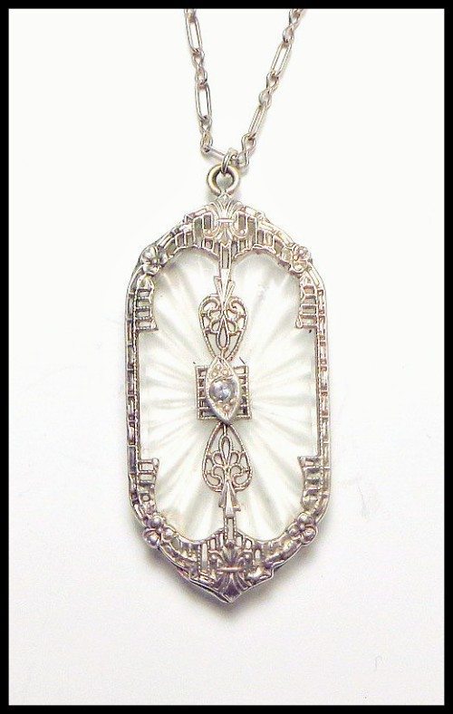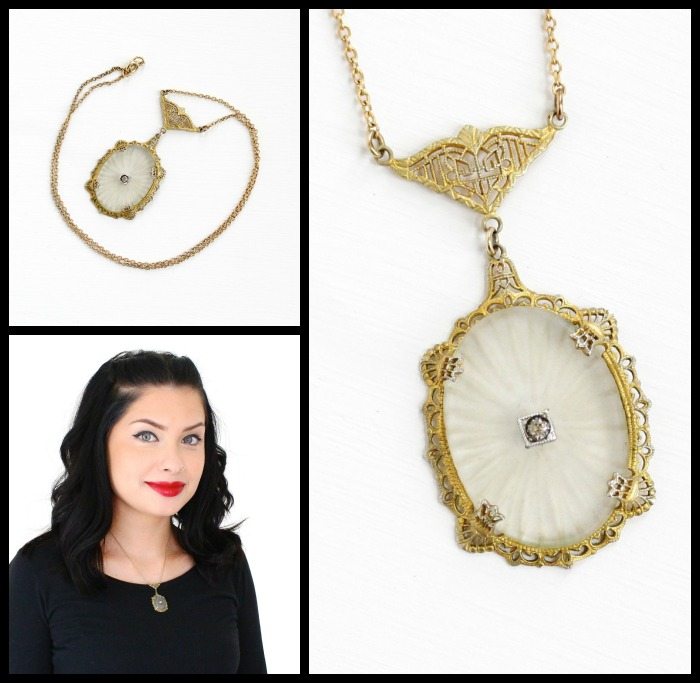 This necklace is actually rock crystal: the more expensive material that camphor glass was intended to mimic. I think it’s exquisite; uncomplicated and delicate, with whispers of filigree.
