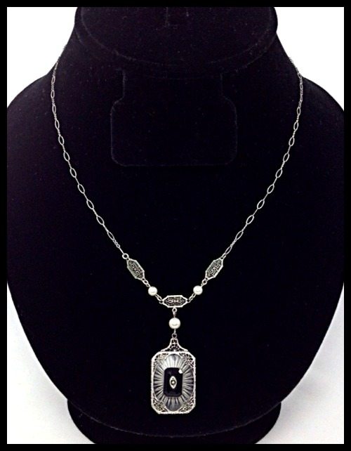 Speaking of camphor glass with a twist: how great is the onyx detail on this pendant? I love that chain, too, with the filigree links and pearls. Find it here.
