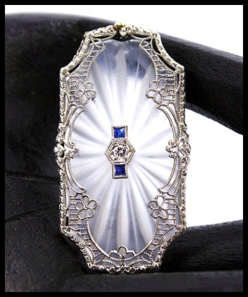This brooch is like a lesson in the Art Deco aesthetic, with its close, precise lines of the filigree stripes juxtaposed with the delicate floral elements and the wide, clean expanse of the camphor glass punctuated by the hexagonally-set diamond with its flanked sapphires. Delectable.