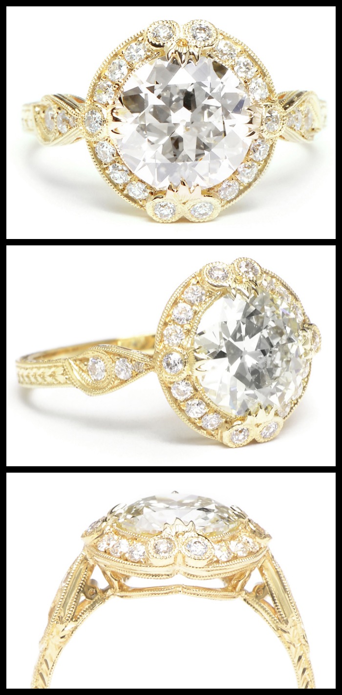 Sadly, this is the only photo of this Fred Leighton ring (which I believe merits the technical term “amazeballs”) that I could find online, but OH what a picture it is. It’s a contemporary ring, with a deliciously juicy 4.62 carat J/VS1 Old Mine cut diamond in yellow gold filigree.