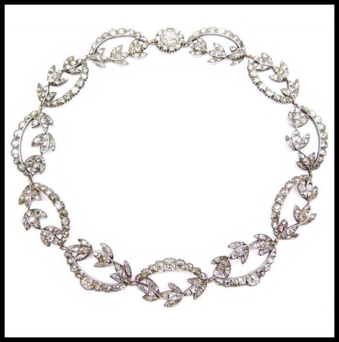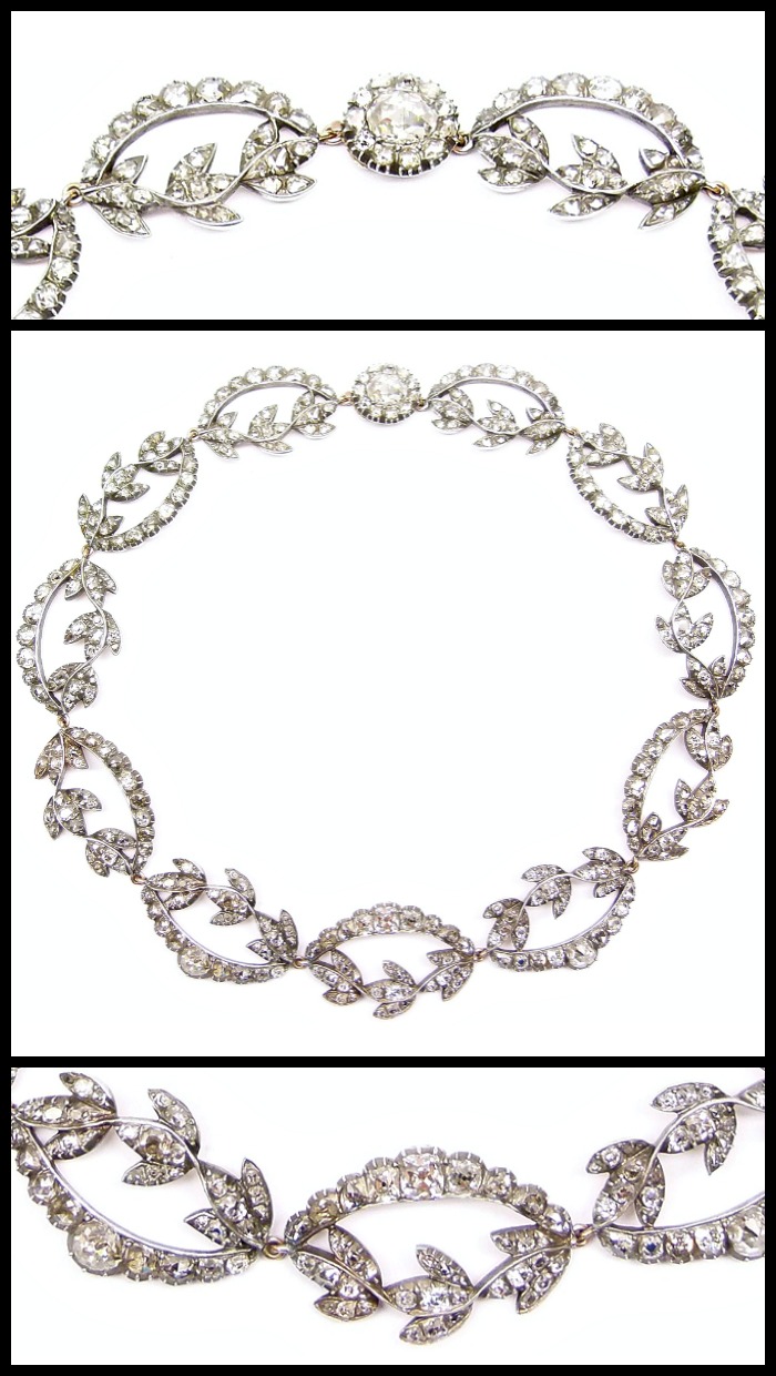 As you can see, its design is somewhat wreath-like, with a series of navette-shaped links formed each by one diamond-set crescent and one foliate swag, gently intertwined. These lovely links culminate at the nape of the neck with a beautiful rose-shaped clasp set with the largest diamond in the whole piece.