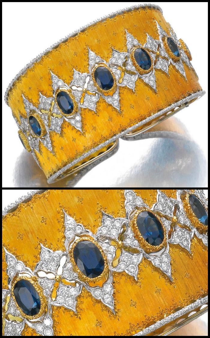This was one of the coolest pieces I saw. The central band of this ring is half ruby and half sapphire. The outer diamond bands are hinged; they can flip flop either way. It’s [insert math here] rings in one!
