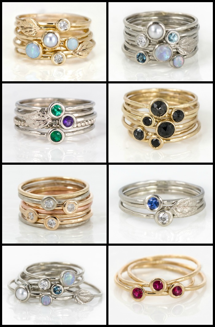 Here are a few of the classic Melanie Casey stacking ring sets – they come in rose, yellow, and white gold; all kinds of textures, and in almost any gemstone. The possibilities for customization are endless.