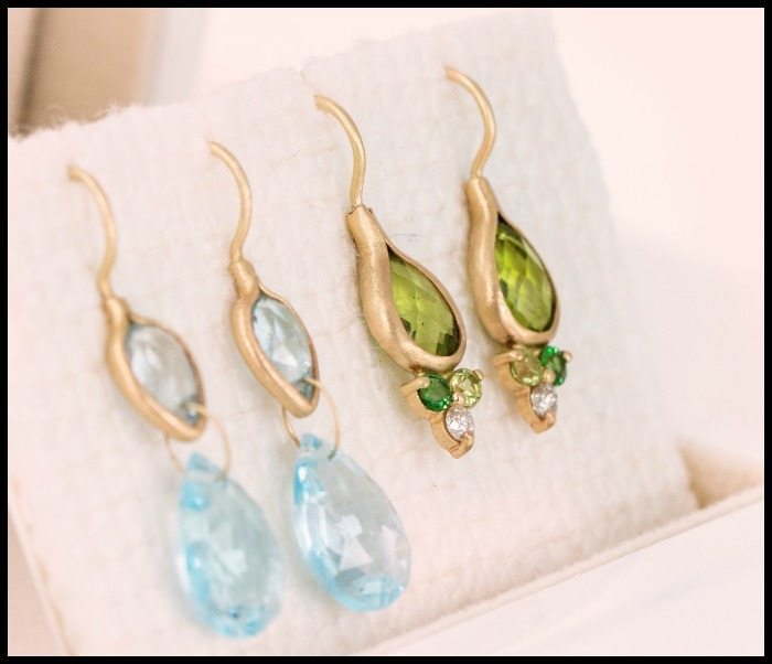 Can I interest anyone in some brilliantly colored gemstone earrings? I think both of these are great, but it’s the gently faceted pair of peridots in the back that really caught my eye.