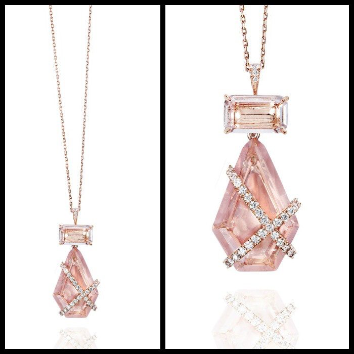 Here’s the necklace that started it all. It’s the Denise II in pink: an 18kt rose gold pendant with rose quartz, and rock crystal quartz, and carefully positioned lines of diamond pavè. It’s sweet and fresh and stunning. It’s named after a member of Rachael’s family, like all of her pieces are.