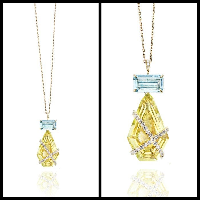 Here’s the Denise II necklace (my fave) in yellow quartz and aquamarine with diamonds. Gorgeous, yes? Do you prefer this color combo or the all pink? I’d be hard-pressed to choose. This one is so fresh and light.