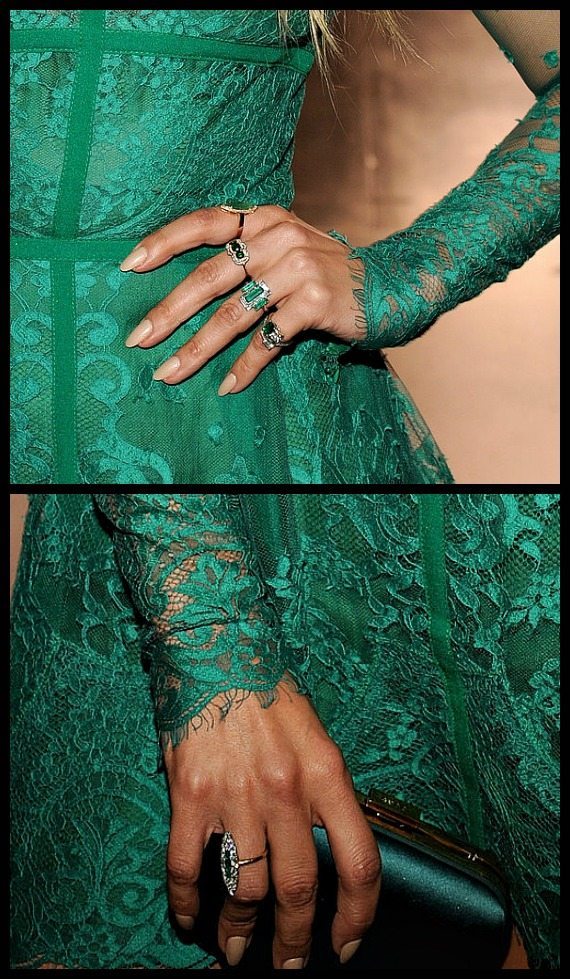 She sticks to the same colors, but goes for all kinds of shapes. There’s nothing but a navette-shaped stunner (antique?) on her right ring finger, while the left hand boasts a chunky navette that maaay actually be jade, a pretty three-stone, a large, color-blocked beauty and a small pinky stack or combo ring. I think her nail color is boring, but whatever. She – or her stylist – still gets major points in my book.
