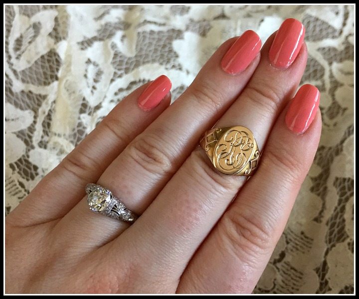 My signet ring has been waiting patiently in a drawer of my jewelry armoire since I found him last fall (thanks again to Susan of Circa 1700 for the find!). I’m very excited to finally be almost ready to integrate it into my regular rotation. Get ready to see this ring a LOT.