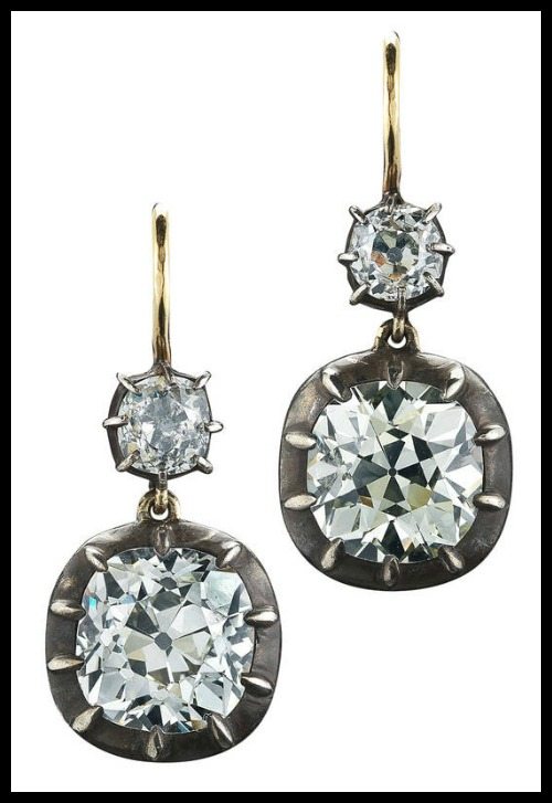 Glorious 9.46 carat antique cushion cut diamond drop earrings.