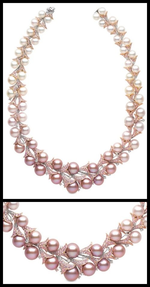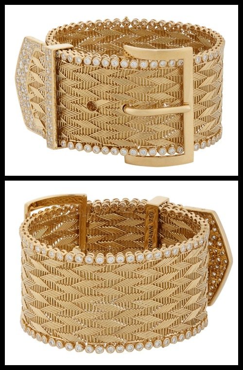This ring from the fabulous Wendy Brandes is simply one of the coolest things I’ve ever seen in my life. It’s rose and white gold with platinum; studded with 4.5 cts of tsavorite garnets along with brown diamonds, white diamonds, rubies, and Kashi pearls.