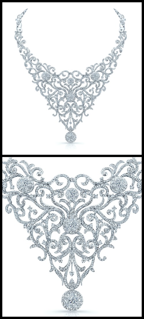 This is the Erica Courtney “Starburst” necklace with a 15.25 carat opal, accented with pink spinels, demantoid garnets, and diamonds. I just love that chain with its bright, precious fringe.