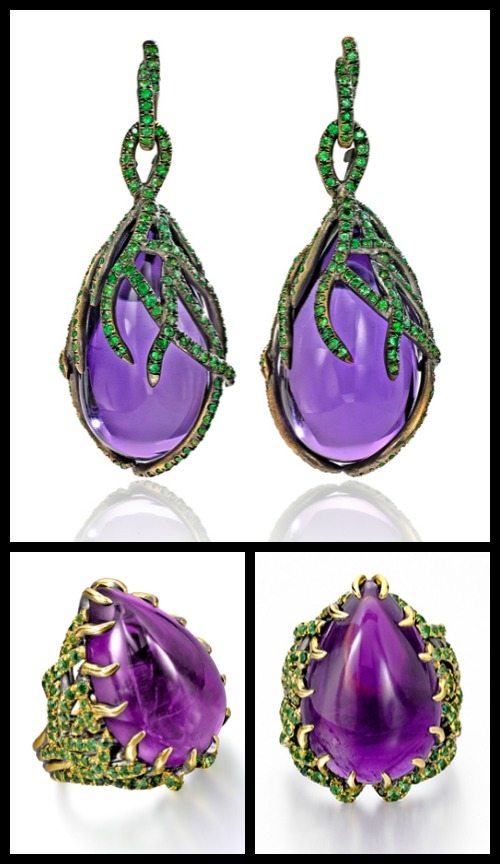 Here’s a really cool piece – the “Peacock Slave” ring by Cynthia Back. Amthyst and demantoid garnet in 18 gold.