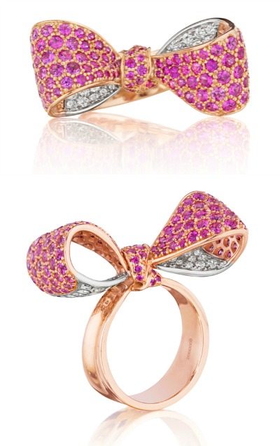 The bow ring also comes in yellow sapphire, with white diamonds and yellow gold.